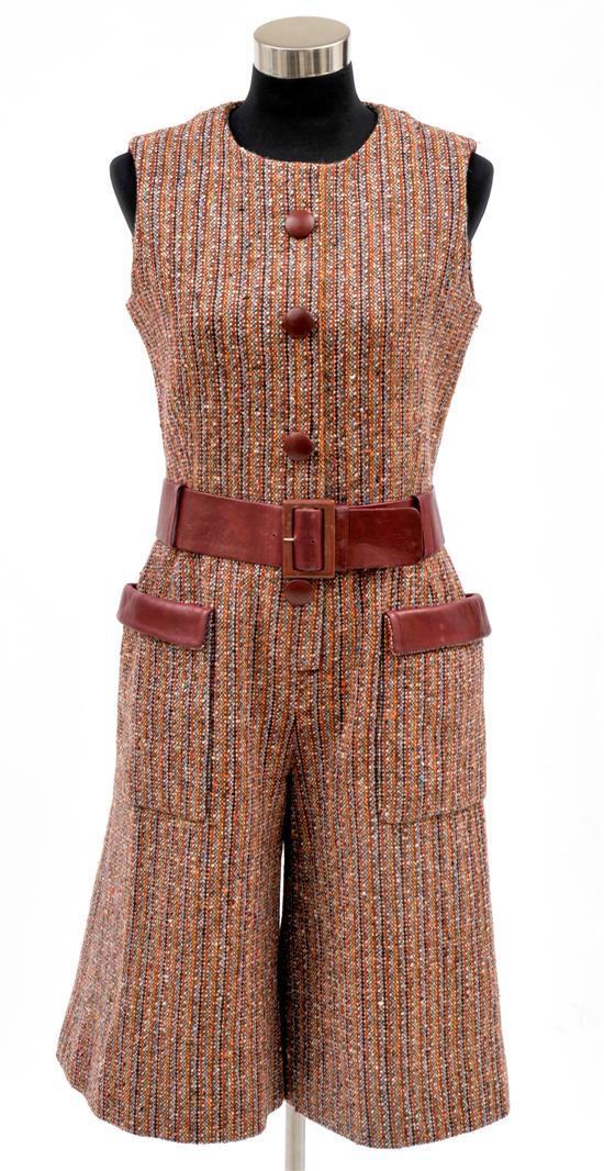 Labelled ' Bernard Perris', cut in a multi striped woollen tweed, the sleeveless all in one suit with wide guacho style shorts, patch pockets with leather trim and belted with a coordinating leather belt.