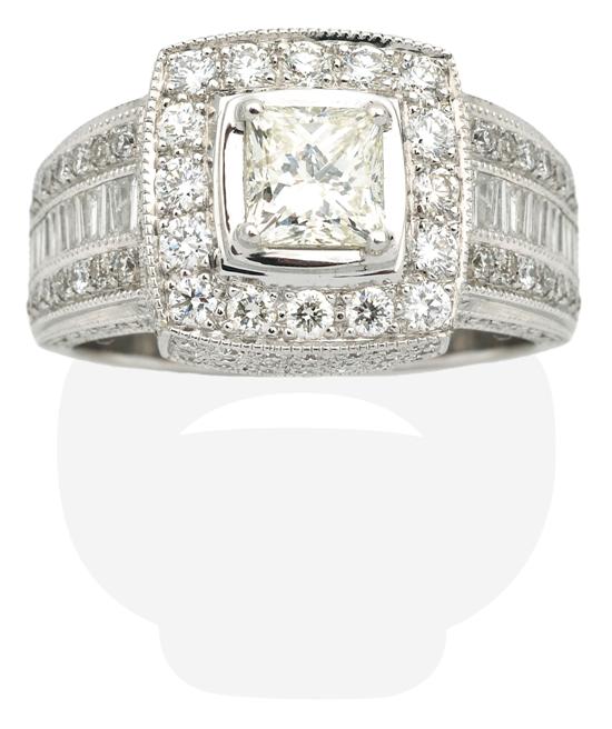 Centrally set with a princess cut diamond weighing 1.01cts, surrounded by round brilliant cut diamonds and further round brilliant and baguette cut diamonds to the shank and shoulders totalling 2.20cts, in 18ct white gold, independent valuation available, ring size M-N.