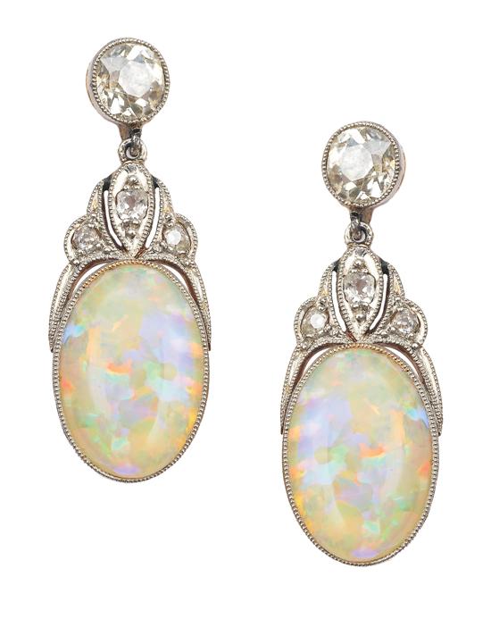 Each earring set with a solid oval opal displaying fine play of colour, to a diamond set pierced surmount, suspended below an old European cut diamond stud weighing 0.33cts, in millegrain decoration, in 15ct gold and platinum.