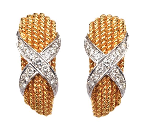 The elongated hoops in rope twist finish, with applied stylized diamond set cross, to post and clip fittings, in 18ct gold.