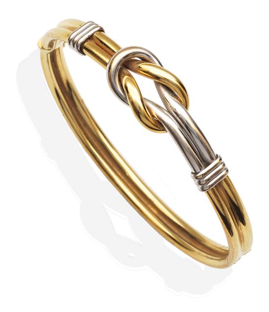 The hinged bangle of knot design, in two tone 18ct gold, total weight 16.3gms.