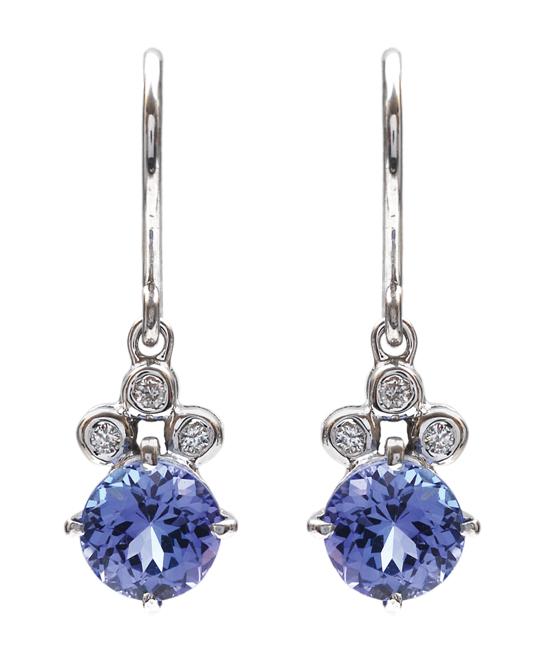 Each articulated drop comprising a round tanzanite surmounted by three small round brilliant cut diamonds, to shepherd hook fittings, in 18ct white gold.