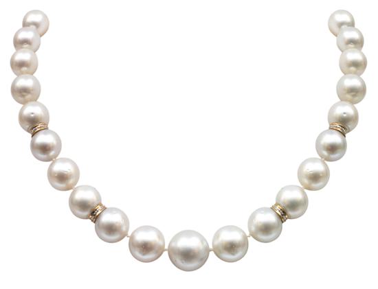 Comprising thirty one near round pearls of creamy white hues, measuring 11.0 to 15.4mm, spaced by gold roundels, to a two tone clasp, in 14ct gold, total length 420mm.