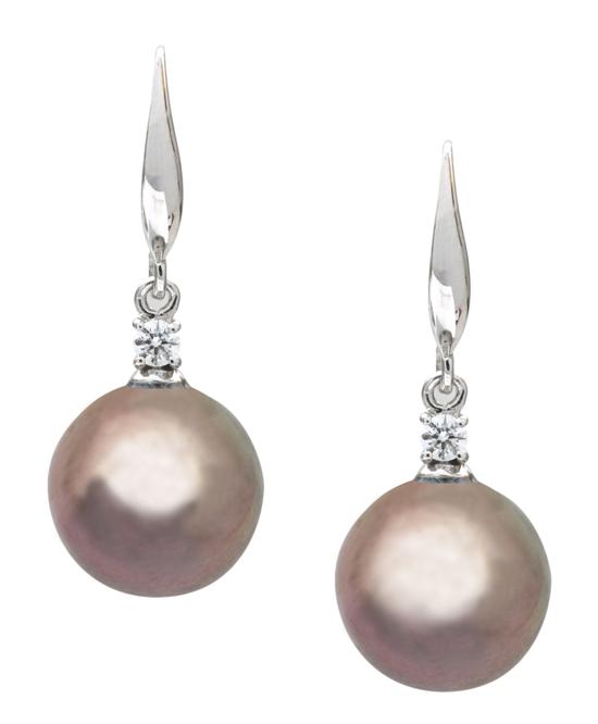 Each drop comprising a near round pearl of green and grey hues measuring 11.3mm, surmounted by a round brilliant cut diamond, to shepherd hook fittings, in 18ct white gold.