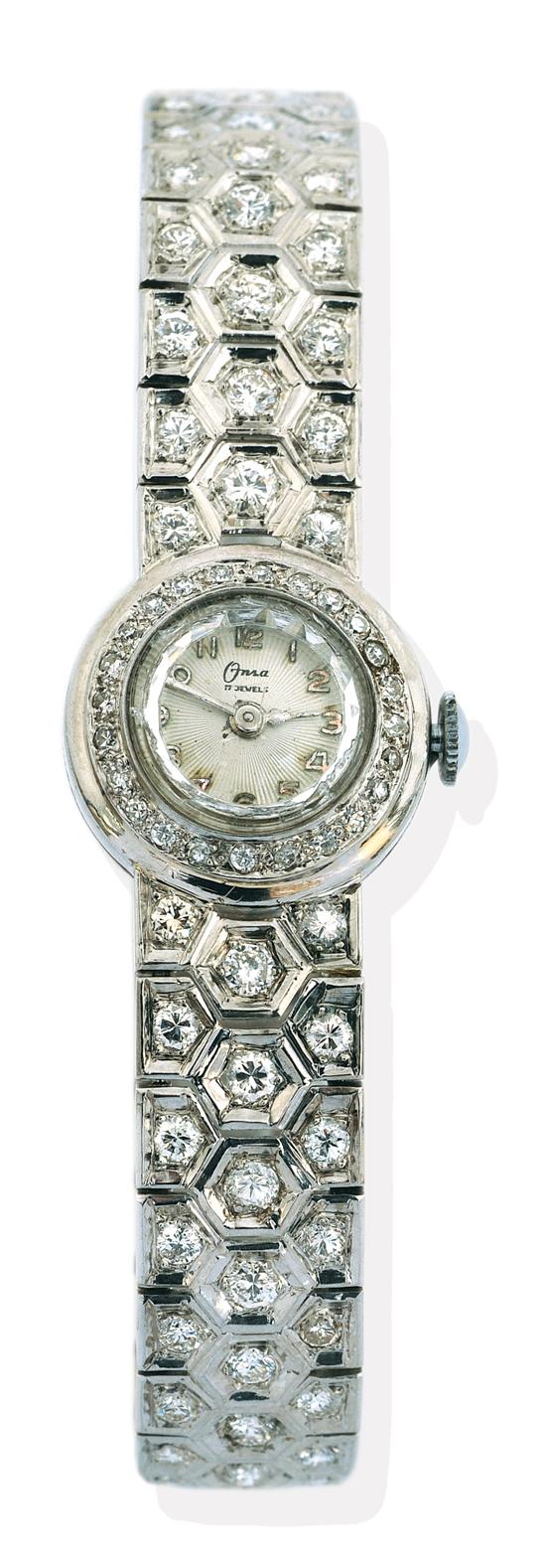 Manual wind movement, circular silvered dial with Arabic numerals, 18ct white gold case with diamond set bezel and conforming diamond set pentagonal link bands, total weight 29.6gms, total length 175mm, 15mm diameter.
