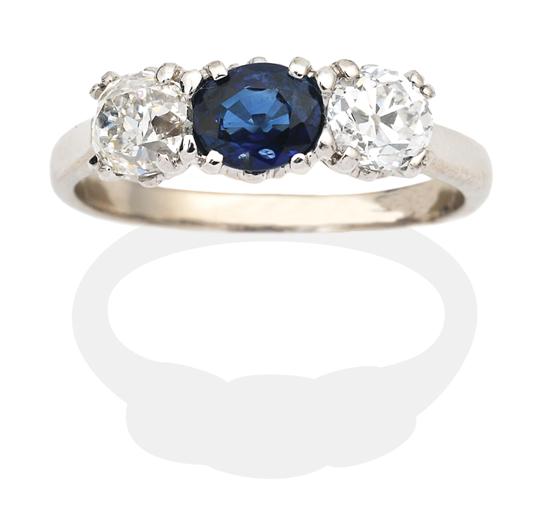 Centrally set with an oval sapphire weighing 0.62cts, flanked by an old style vintage cut diamond to either side, totalling 1.10cts, in 18ct white gold, independent valuation available, ring size L-M.