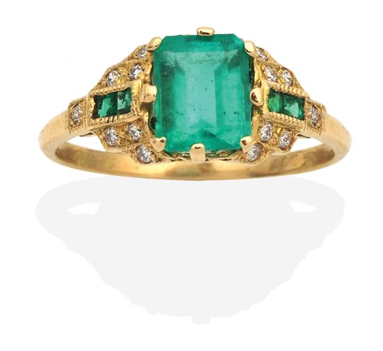 Centrally set with an emerald cut emerald weighing 1.26cts within emerald and diamond set shoulders in millegrain decoration, in 18ct gold, independent valuation available, ring size M-N.