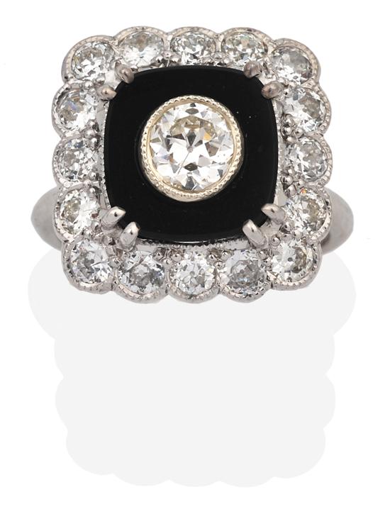 The square onyx centred with an old style vintage cut diamond weighing 0.57cts, within a border of sixteen diamonds in scalloped setting in millegrain decoration, in 18ct white gold, independent valuation available, ring size K-L.