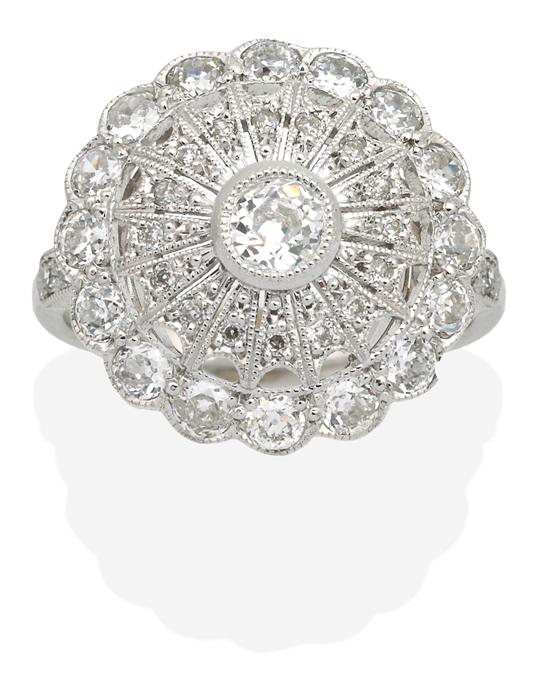 The circular pierced plaque centrally set with an old style vintage cut diamond weighing 0.34cts surrounded by radiating diamond set panels and an outer border of diamonds in millegrain decoration, in 18ct white gold, independent valuation available, ring size N-O.