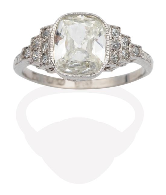 Centrally set with a cushion cut diamond weighing 1.36cts, within stepped diamond set shoulders in millegrain decoration, in 18ct white gold and platinum, independent valuation available, ring size L-M.