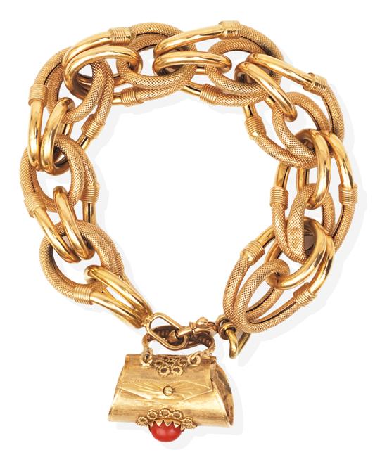 The fancy link bracelet with coral set handbag charm in 18ct gold, total weight 44.1gms, total length 220mm.