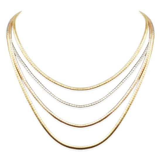 The four row collar comprising textured flat links, total weight 59.4gms, total length 430mm, all in 18ct gold.