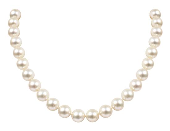 Comprising thirty nine near round pearls of creamy white hues, measuring 9.3mm to 12.0mm, to an oval clasp in 18ct white gold, total length 470mm.
