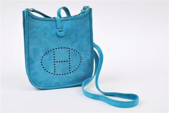 The 16cm handbag in light blue suede with conforming shoulder strap and silver metal hardware.