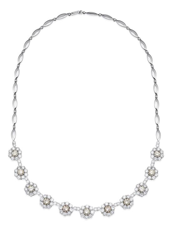 Comprising eleven floral clusters, each centrally set with a cognac diamond weighing 0.41cts, within a border of white diamonds, and diamond set spacer links, total diamond weight 13.41cts, in 18ct white gold, total length 425mm, boxed, independent valuation available.