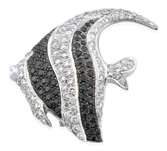 Modelled as an angel fish, pave set with black and white round brilliant cut diamonds with a yellow diamond eye, in 18ct white gold, independent valuation available.