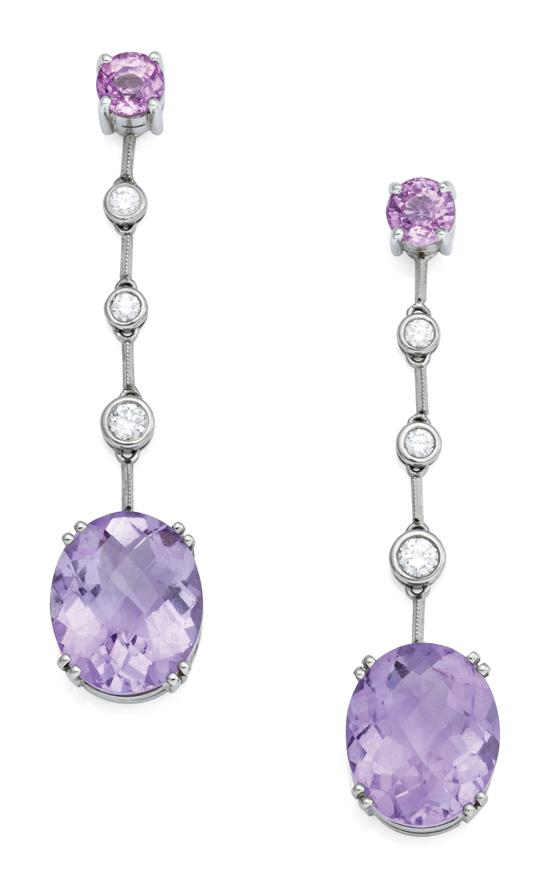 A PAIR OF AMETHYST, PINK SAPPHIRE AND DIAMOND EARRINGS