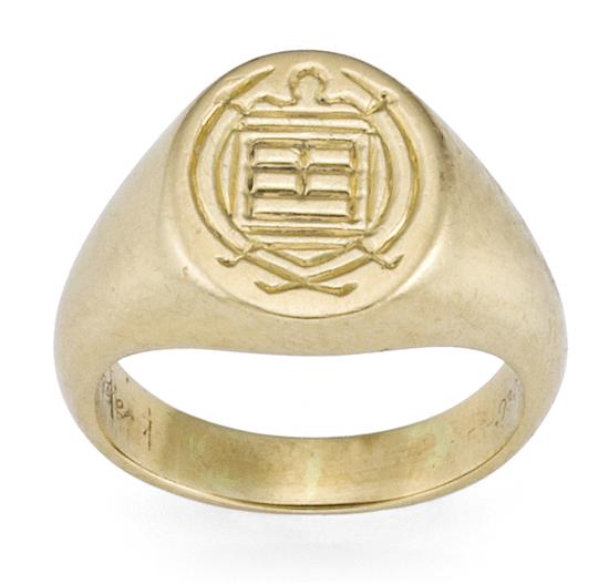 The oval plaque engraved with a crest, in 18ct gold, ring size J-K.