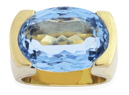 The oval topaz weighing 13.50cts, semi-collet set in a wide band, in 18ct gold, ring size M-N.