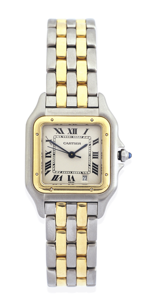 Quartz movement, square off white dial with Roman numerals, date aperture at five, signed case, dial and movement, stainless steel case with gold detail and conforming bracelet bands, case length 25mm.