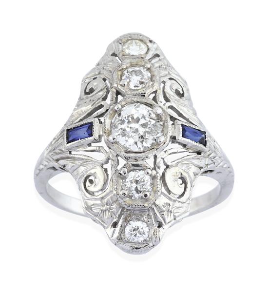 The pierced plaque set with five old European cut diamonds with sapphire detail, in 14ct white gold, ring size N-O.
