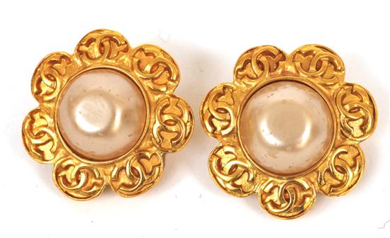 Styled as a flower with monogram design and faux pearl centre, in gilt metal to clip fittings.