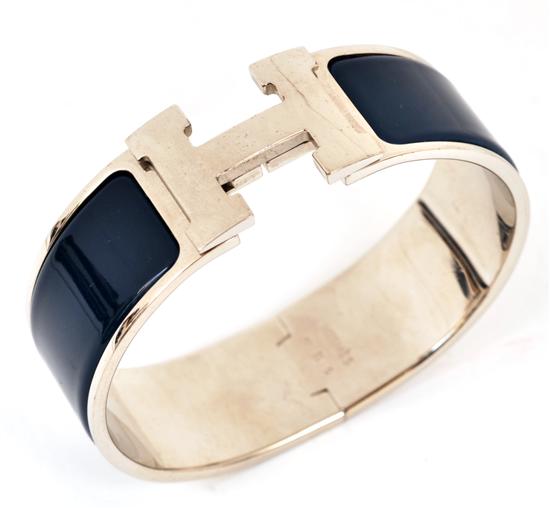 The sterling silver and navy blue enamel cuff with 'H' clasp.