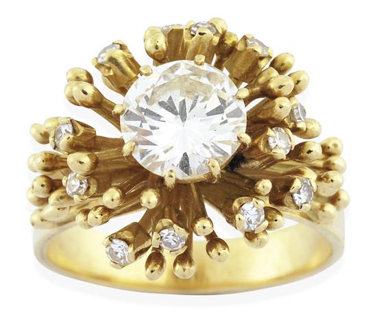 Of abstract cluster design, centrally set with a round brilliant cut diamond weighing 1.45cts, within diamond set spokes, in 18ct gold, New Zealand Gem Laboratory certificate available, ring size O-P.