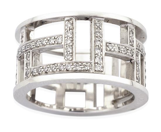 From the 'Mosaic' collection, the wide pierced geometric band set with round brilliant cut diamonds totalling 1.36cts, in 18ct white gold, boxed, independent valuation available, ring size N-O.