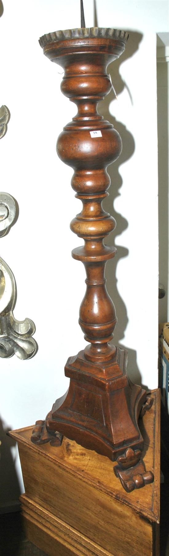 A PAIR OF FRUITWOOD TORCHERES Each with a turned stem above a tripartite base, together with a triangular pedestal, the torcheres 124cm high.