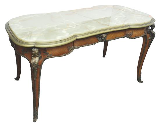 The lobed rectangular top inset with onyx, within a gilt metal surround above a frieze drawer centred by a cherubic mast head mount, raised on cabriole legs with maiden mast head chutes terminating in foliate cast sabots, 137 x 78 x 75cm.