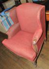 Each with a semi wing back above carved and upholstered arms and fitted cushions, raised on scroll supports