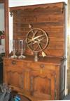 The boarded plate rack above a chamfered rectangular top with two frieze drawers and arched panelled doors, raised on scroll supports, 130 x 208.5 x 57cm.
