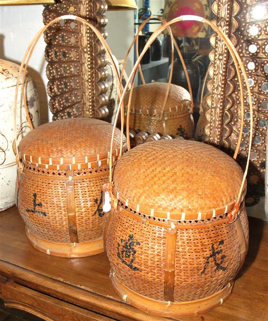 A PAIR OF WOVEN CANE BASKETS Each with a high looped handle, 70cm high.