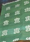Decorated with white geometric motifs on a variegated green ground, fringed to ends, 260 x 120.