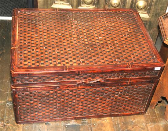 A STAINED WOVEN BAMBOO LIDDED TRUNK