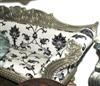With a carved crest rail and scroll arms, upholstered in black flocked botanical print, raised on turned supports, 232cm length of back.