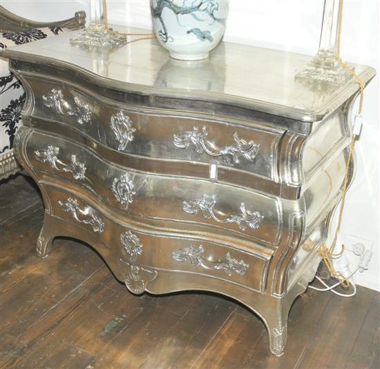 A LOUIS XV STYLE SILVER FOIL OVERLAID COMMODE