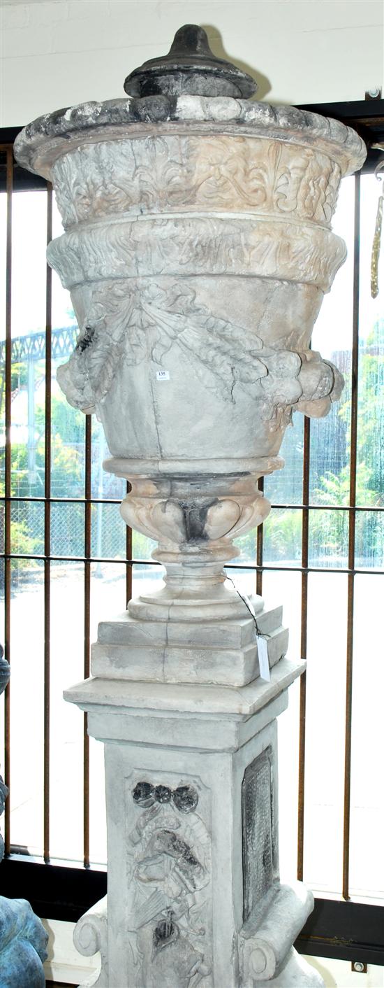 A MONUMENTAL COMPOSITE STONE URN ON PEDESTAL