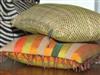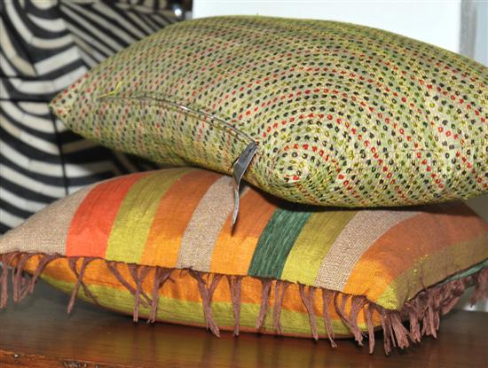 TWO SCATTER CUSHIONS One rectangular, hand stitched and printed, the other square, with a woven stripe.