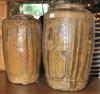 TWO CYLINDRICAL EARTHENWARE JARS Each with an incised stylised figural design, with a grey-green glaze, the tallest 43cm high.