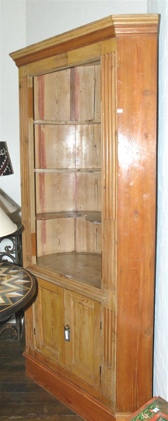 A FRENCH PROVINCIAL STYLE PINE CORNER CABINET With a cantered fall cornice above an open central section with three shelves, the lower section with two panelled doors, 120 x 215.5 x 55cm.