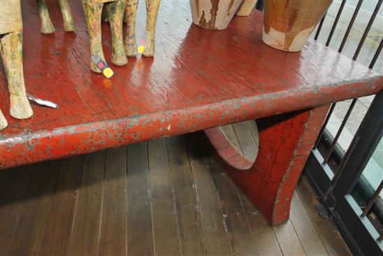 The rectangular top above canted supports with circular cut-outs, 250 x 75 x 95cm.