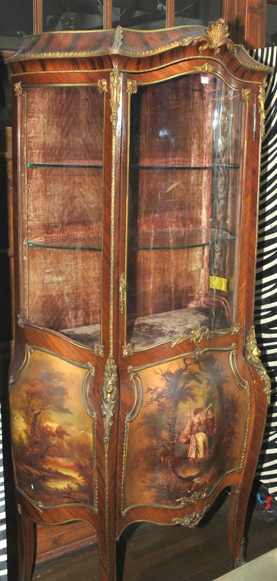 The shaped pediment above a central bowed glazed door and sides with a bombe base depicting painted with romantic scenes, the whole with foliate gilt metal mounts, 85 x 180 x 37cm.