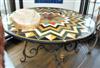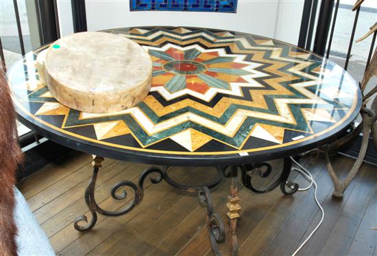A MARBLE AND WROUGHT IRON SPECIMEN TABLE The circular top with a radiating geometric pattern in multicoloured marble specimens, above a scrolling wrought iron base,151 cm diameter x 71cm high.
