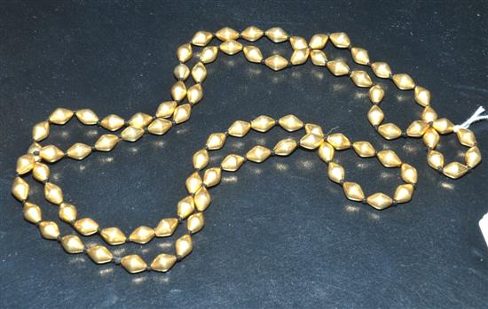 A GOLD WAX BEADED NECKLACE The lozenge shaped beads individually knotted.