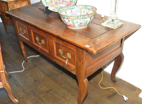 A WALNUT REFECTORY STYLE HALL TABLE Rectangular plank topped with three small recessed drawers below raised on shaped legs, 161 x 69 c 81cm.