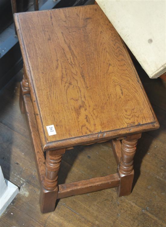 A GEORGE III STYLE FRUITWOOD JOINED STOOL Rectangular, with a shaped skirt, raised on turned tapering legs, 44 x 46 x 28cm.