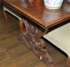 The planked and mitred top above a carved skirt, raised on three shaped and relief carved pedestal supports, 296 x 80 x 98cm.