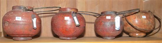 A GROUP OF FOUR PAINTED WOODEN CONTAINERS Each of ovoid form with a steel loop handle, the tallest 20.5cm high.